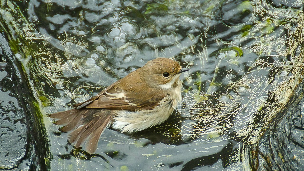Op de foto van Marianne Kegge zie je een bruin vogeltje met een witte buik, wat witte veren op de rug en een spitse snavel heerlijk badderen in de vijver van de familie Kegge. Marian denkt aan een jonge bonte vliegenvanger en ik kan haar gelijk geven. Dit is inderdaad een jonge bonte vliegenvanger en dus wordt het verenpak nog aangepast tijdens het opgroeien.