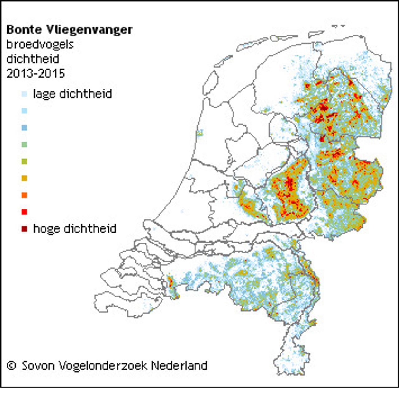 Bij volwassen bonte vliegenvangers zijn de bruine veren vervangen door zwarte en het wit steekt dan nog sterker af. Marianne verbaast zich er wel over dat ze deze vogel in West-Brabant is tegengekomen. Het klopt wat ze schrijft over de locaties waar ze deze bonte vliegenvangers eerder gezien heeft: Drenthe en Veluwe. De meeste bonte vliegenvangers zijn te vinden op het Drents Plateau en op de Veluwe. Toch kunnen ze ook voorkomen in West Brabant. Op het bijgevoegde kaartje van SOVON kun je zien dat er een minimale bezetting is van bonte vliegenvangers in West-Brabant, maar deze vogelsoort is zich wat meer aan het uitbreiden in Nederland.