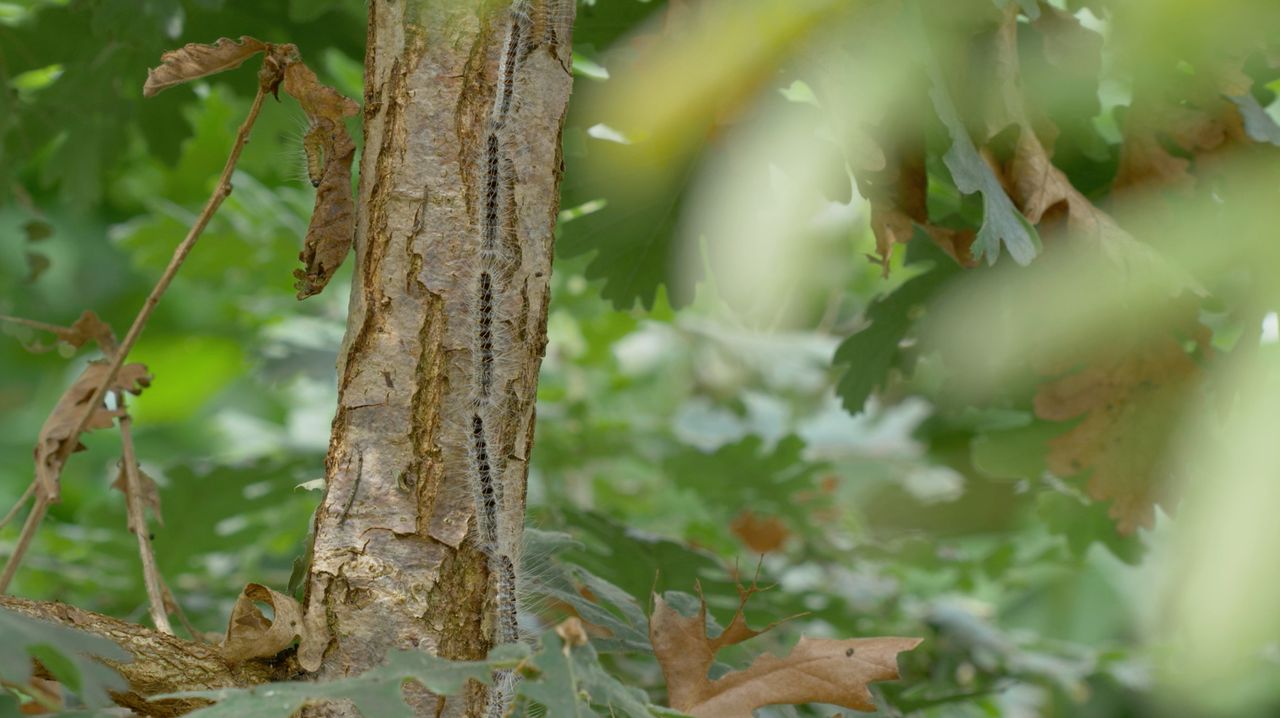 De eikenprocessierups legt eitjes in een nest op de schors van de eikenboom. Ze beheersen verschillende technieken om zichzelf te beschermen. “Hun nesten zijn omgeven met een spinsel om gevaar, zoals vogels, op afstand te houden. Ook lopen ze in de veiligheid van de groep de stam op om de bladeren bovenin de boom te eten", vertelt Tim.