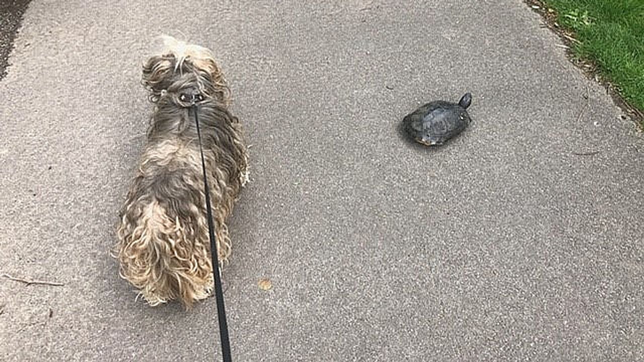 Schildpad aan de wandel in Eindhovens park, 'Pas op, teen hapt 'ie er zo vanaf!'