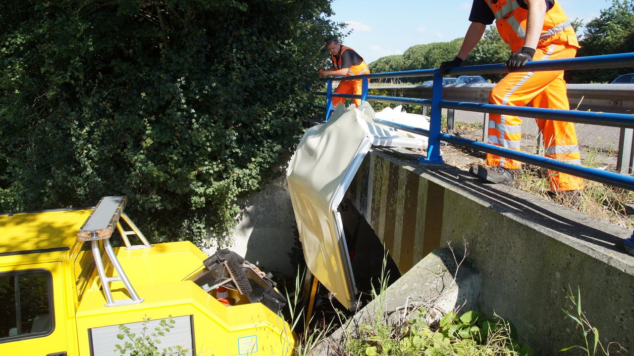 Het dak werd van de laadbak gerukt en bleef hangen aan de reling. Bij de tunnel staat een bord dat een voertuig maximaal 2,20 meter hoog mag zijn om door de tunnel te mogen rijden.