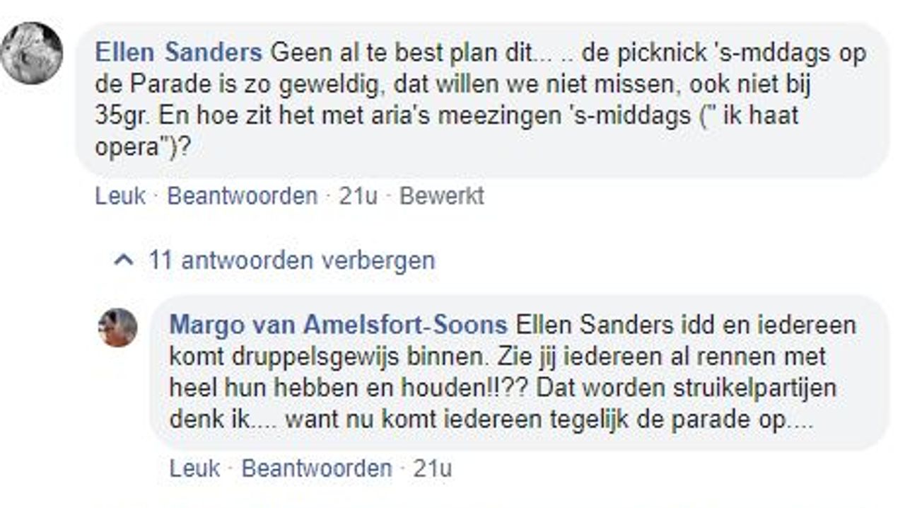 In de vroege middag komen normaal de picknickmanden met lekkers en drankjes tevoorschijn als het weer Opera op de Parade is. De klapstoeltjes worden dan geïnstalleerd en er vinden spontane reünietjes plaats van jaarlijkse bezoekers. Deze gezelligheid moeten de liefhebbers nu missen omdat de organisatie de Parade tot de avond afsluit.