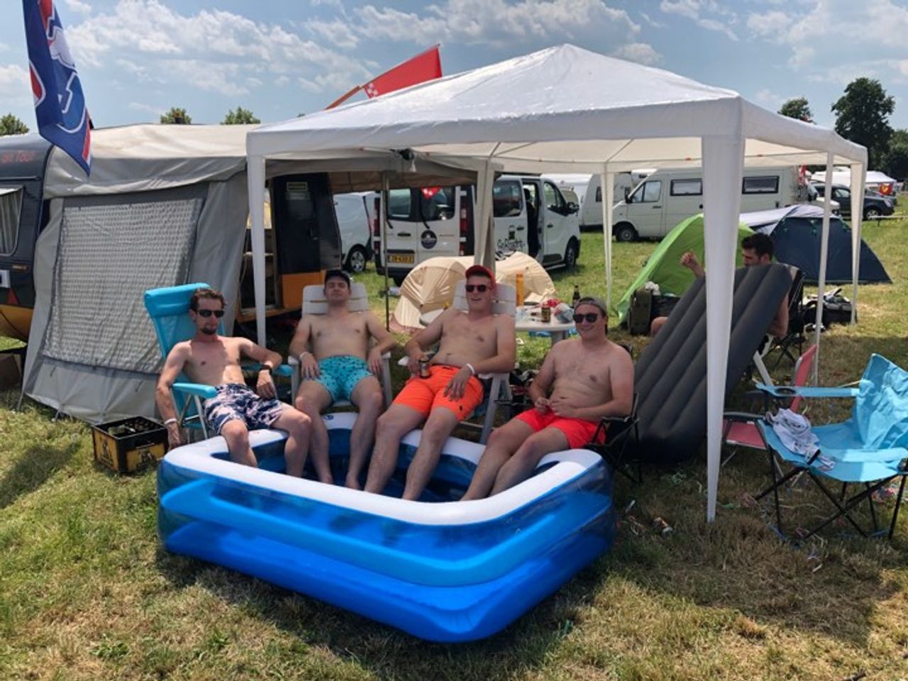 De vriendengroep volgt de verrichtingen van Max Verstappen op de voet. "Wij hebben de trainingen allemaal gekeken. Hoewel het wel warm is op de tribune. Daarom gaan wij ook vaak terug naar de camping om even af te koelen."