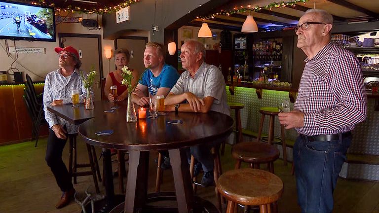 Vooral de slotkilometers van de etappe worden goed bekeken in de kroeg. Kruijswijk blijft derde in het algemeen klassement en loopt een halve minuut in op koploper Julian Alaphilippe. "Het is nu nog te vroeg om in de gele trui te komen. Het gaat komende week in de Alpen gebeuren. Hij zit in een prima ploeg, kan niet beter", voorspelt een andere supporter.