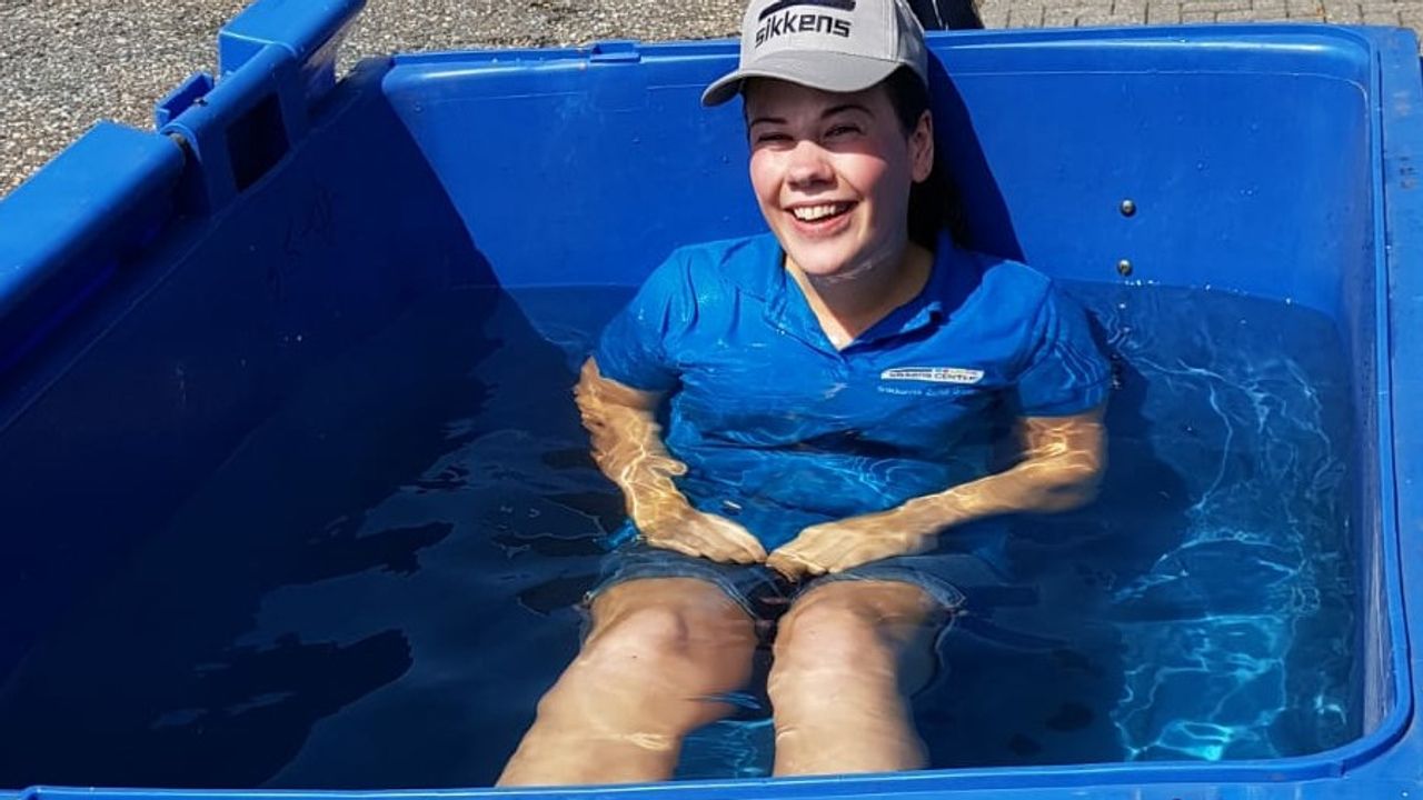 Medewerker Christina Baan van Sikkens Raamsdonksveer zoekt verkoeling in een container gevuld met ijskoud water.
