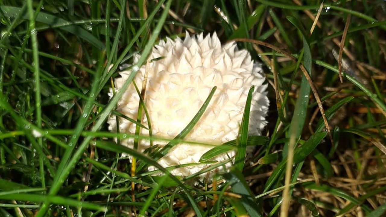 Op de foto van 'Buuf' Adeline Besselink zie je een witte bol met veel stekels. Het is een zwam of paddenstoel. Dit is een jonge parelstuifzwam. Die komt redelijk veel voor in diverse bossen, parken en tuinen. Binnen de groep stuifzwammen is dit zelfs de meest voorkomende soort. Aangezien dit een jong exemplaar is, heeft deze zwam nog puntige stekeltjes. Later verliezen zij deze stekels, want erg vast zitten ze niet en dus laten ze gewoon los. Je ziet dan een veel egalere paddenstoel met toch nog wat structuur. Parelstuifzwammen zijn zwammen die van dood materiaal leven. Ze zijn dus saprofyt. Ze kunnen in ongunstige omstandigheden klein blijven, maar in gunstige omstandigheden wordt de bol toch snel zo’n zes centimeter breed.