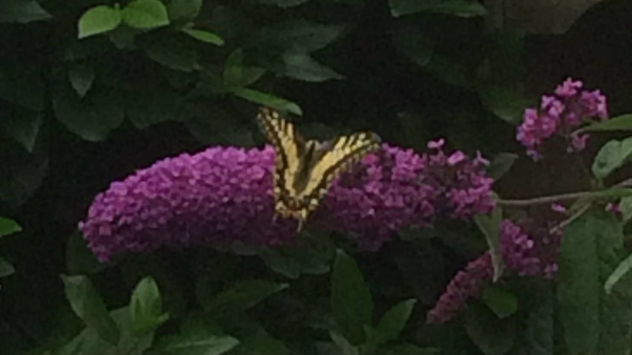 Op de foto die Peter de Vaan me stuurde, zie je op een bloem van een buddleja - ofwel vlinderstruik - een van de mooiere dagvlinders van Nederland, namelijk de koninginnenpage. Je ziet namelijk een vlinder met overwegend gele kleuren en op de vleugels met opvallende zwarte vlekken en strepen. Op het eind van de vleugels zie je ook nog twee langwerpige, zwartgekleurde vleugelaanhangsels, die je slippen noemt. Deze dagvlinder heeft een spanwijdte van maximaal 75 millimeter en is daarmee de grootste dagvlinder in Nederland. Volwassen koninginnenpages gaan niet echt meer op zoek naar voedsel. Ze leven ook maar enkele weken. Ze zoeken vooral partners om te paren. Na de paring zetten de vrouwtjes maximaal vijfhonderd eitjes af op verschillende planten van de schermbloemenfamilie. Vrouwtjes van de eerste generatie zetten de eitjes vooral af op wilde peen (gecultiveerde kan ook) en dan op de bovenkant van jonge bladeren. De vrouwtjes van de tweede generatie koninginnenpages zoeken bij diverse schermbloemigen - wat ook de wilde peen kan zijn - de bloemen en of bladeren van schermbloemigen op die zijn begonnen met bloeien. Elk eitje wordt dan op een andere bloemknop of bladtop afgezet.