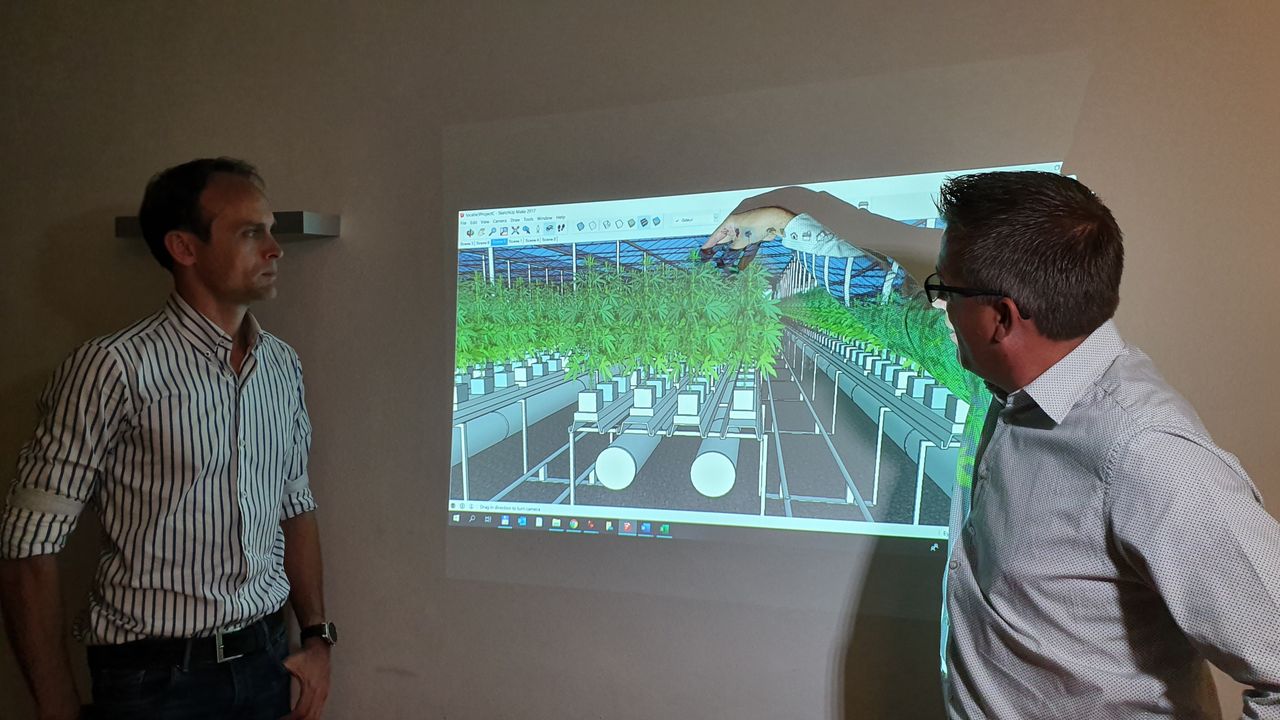 Op het scherm laat Van Oers een animatie en ontwerp van de kas zien waarin de cannabisplanten moeten komen. "We kopen waarschijnlijk een bestaande kas en bouwen die om." Een monsterklus, omdat het niet alleen een kas, maar ook een vesting moet worden.