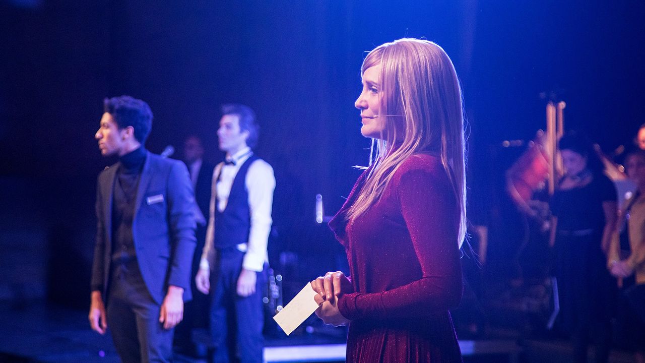 De voorstelling heeft het gevoel van een grote televisieshow. Er zijn twee presentatoren, er zijn live-muzikanten op het podium en er wordt geschakeld naar eenzelfde show in een Duits theater.