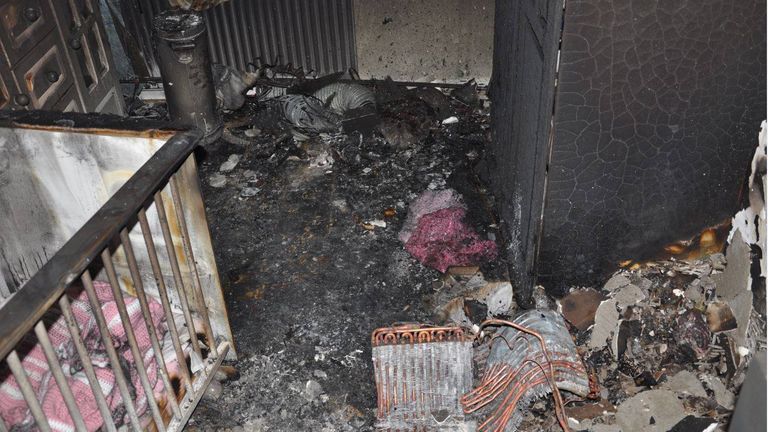 Op de foto’s is te zien hoe de kinderkamer compleet zwartgeblakerd is. Er is nog een roze dekentje te zien, maar voor de rest zit alles onder het roet en zijn de spullen en meubels verwoest.