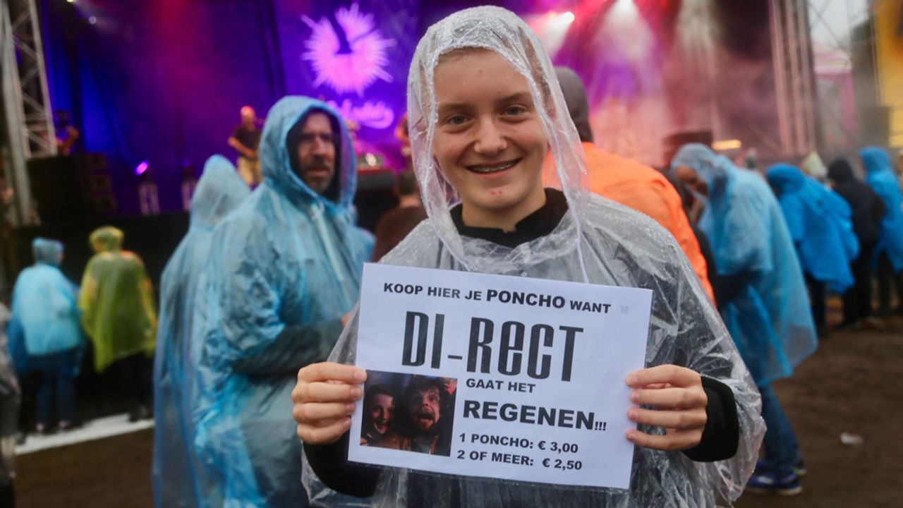 De 14-jarige Ties doet op dat moment goede zaken. Hij bracht poncho's mee en verkoopt ze voor 3 euro per stuk ('Koop hier je poncho's, want Di-rect gaat het regenen'). In vijf minuten tijd is hij helemaal uitverkocht. "Ik had maar tien poncho's bij me maar ik heb zeker 30 euro verdiend."