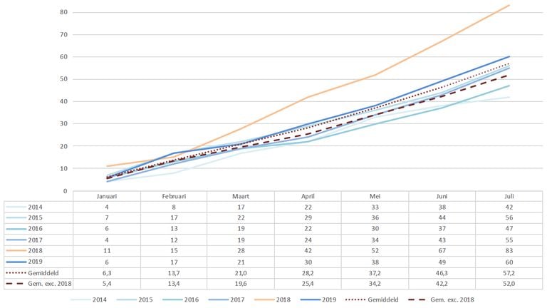 In de onderstaande grafiek is de stijging van het aantal verkeersdoden per jaar goed te zien. De lijn van 2018 en 2019 liggen boven de lijn die het gemiddelde van januari tot en met juli aangeeft.