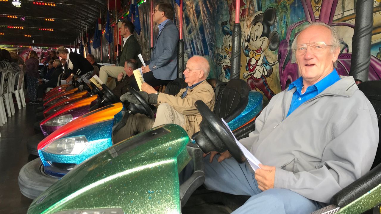 Vanuit een botsauto toekijken bij de doop van kermisbaby in Roosendaal