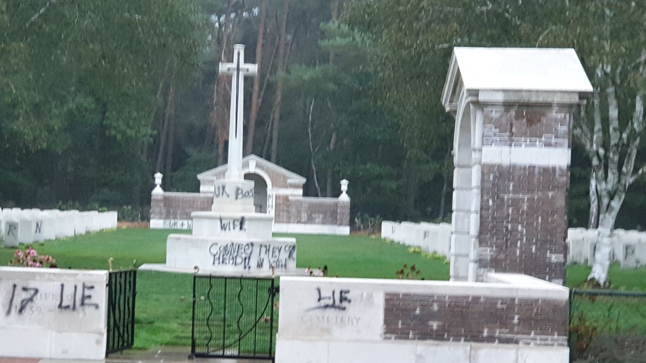 Op de buitenmuur van de begraafplaats ontdekte een voorbijganger vrijdagochtend dat er met grote zwarte letters 'MH 17 lie' was geschreven. Op de binnenmuur van de kapel was een enorm hakenkruis gekalkt en ook de witte grafzerken op het Britse ereveld met 665 oorlogsgraven waren onder handen genomen.