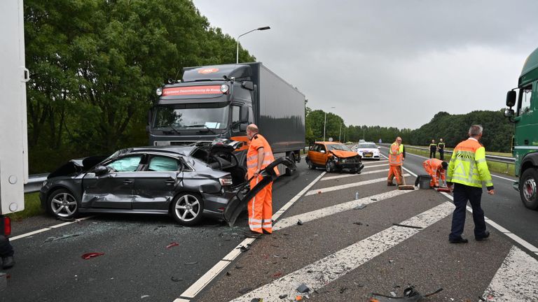 Een auto staat klem tussen twee vrachtwagens in. De auto staat dwars op de weg. In dezelfde rijrichting staat ook een tweede zwaar gehavende auto schuin op de weg. Ten slotte staat in de tegenoverstelde rijrichting nog een vrachtwagen met schade.