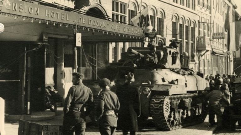 Tankcommandant Danny McCleod van het South Alberta Light Horse Regiment gaat voorop de Grote Markt op. De meeste Duitsers zijn weg.
