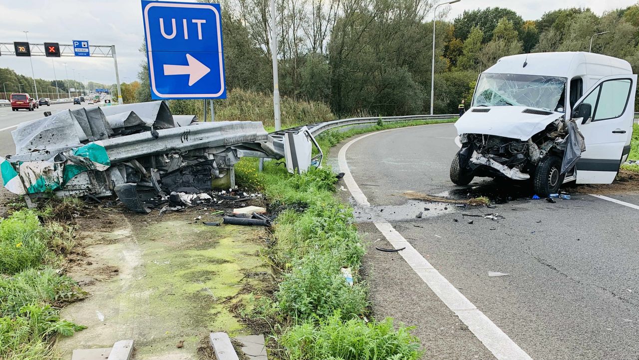 De bestelbus reed hard tegen de zogeheten rimpelbuisobstakelbeveiliger (RIMOB) aan. Dat is een soort kleine vangrail bij een afrit. De RIMOB zit door de harde klap volledig in elkaar. Volgens een fotograaf ter plaatse is zelfs het beton eronder door de harde klap verschoven.