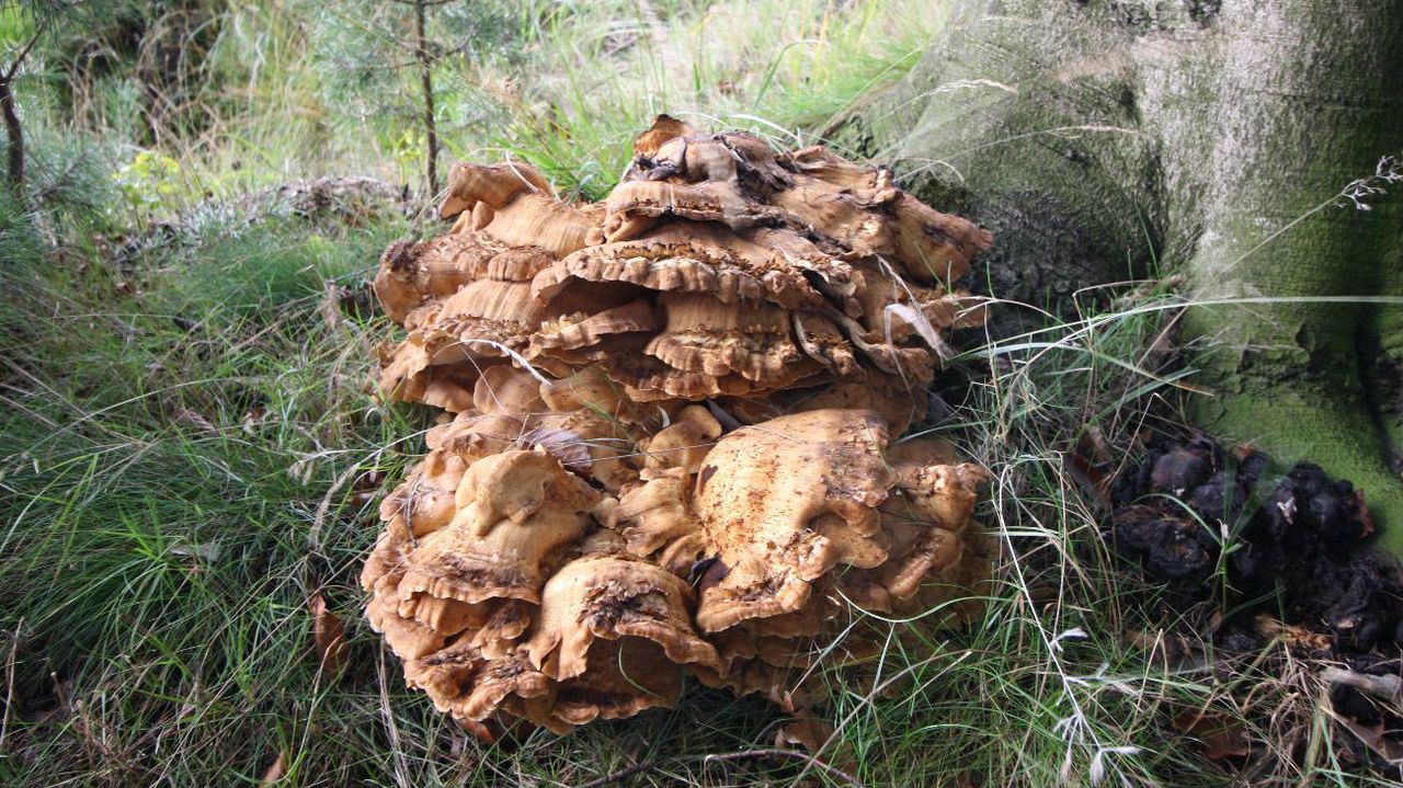 Op de foto van Ad van Gils zie je lichtbruine hoeden van een zwam. Volgens mij zijn dit de restanten van een oude reuzenzwam. Deze zwam is op de terugweg nadat de sporen zijn weggewaaid. Reuzenzwammen bevinden zich vaak aan de onderkant van loofbomen en soms bij naaldbomen. Ze veroorzaken vooral witrot bij die bomen. De reuzenzwam is een eenjarige zwam met heel veel hoeden. Soms is zo’n boom helemaal omringd met de hoeden van de reuzenzwam. Zo’n hoed kan wel dertig centimeter breed worden.