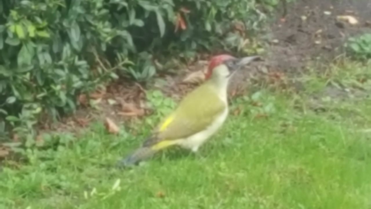 Op de foto die Anthony Verspaget me mailde, zie je een groene vogel op de grond zitten. De vogel heeft achter bij de staart nog wat gele veren en een mooie rode kop en nek. We hebben hier te maken met een groene specht. Dat deze in de tuin bij Anthony komt, is niet zo verbazingwekkend. Je ziet deze vogels de laatste jaren steeds meer in tuinen, op zoek naar voedsel. Groene spechten eten vooral mieren en die vinden ze meer en meer in tuinen en parken. Ze zoeken dan graag in het kort gemaaide gras op losse bovengrond. Daar vinden ze vaak de meeste mierennesten. Met hun spitse snavels boren ze gaten van enkele centimeters diep. Daarna pakken ze de mieren met behulp van hun kleverige lange tongen. Soms verwijderen ze met hun snavels het mos tussen de tegels of stenen. Daar vinden ze ook voldoende voedsel, want heel veel mieren zoeken de warmte van tegels op om daar hun nesten te bouwen.