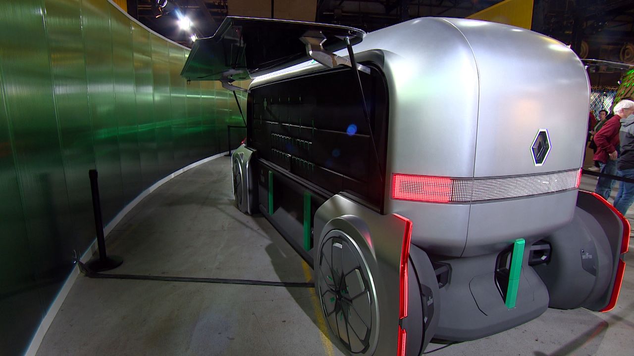 We beginnen met de taxi. Wat opvalt, is de enorme klep die omhoog staat. Ik kan hierdoor rechtop naar binnenlopen. Heel bijzonder. In de taxi kunnen zes tot acht mensen zitten. Janet Richter van Renault Nederland: “Iemand met een kinderwagen moet er ook in kunnen. Of iemand in een rolstoel. We maken ‘m voor iedereen.” De taxi moet in 2030 een aanvulling zijn op het openbaar vervoer. “Je roept ‘m op met een app of je gaat naar een taxihalte.”