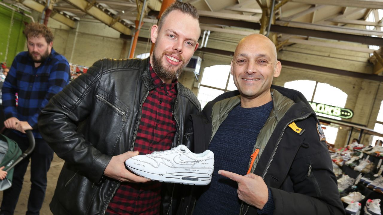 Inmiddels heeft hij zo'n tien paar sneakers in z'n bezit, maar die Airmax 180 zat er nog niet bij. En hij heeft geluk, want bij een van de kraampjes vindt hij ze, spierwit, met blauwe en rode details. Vraagprijs: 200 euro. "Ik ben hier zo blij mee, mijn dag is goed. En zeker ga ik ze dragen, maar alleen met mooi weer, anders worden ze vies."