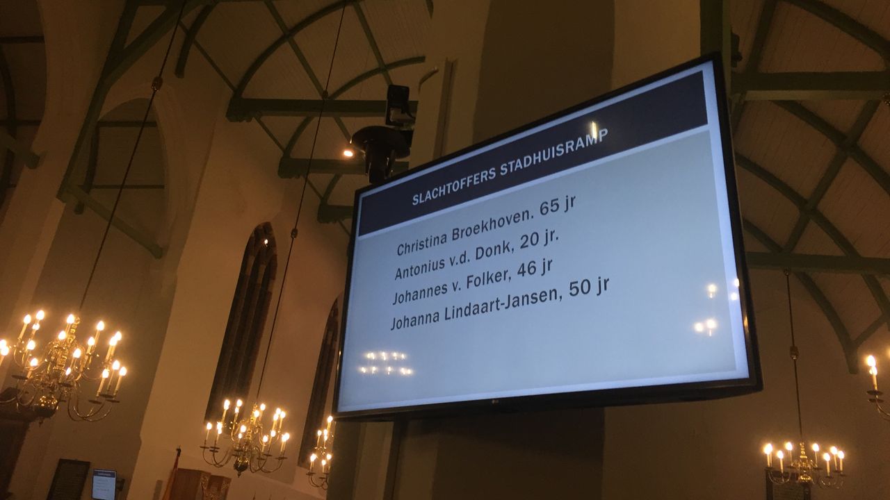 Op schermen die in de hele kerk hingen werd tijdens de herdenkingsdienst de namen geprojecteerd van alle 134 slachtoffers.