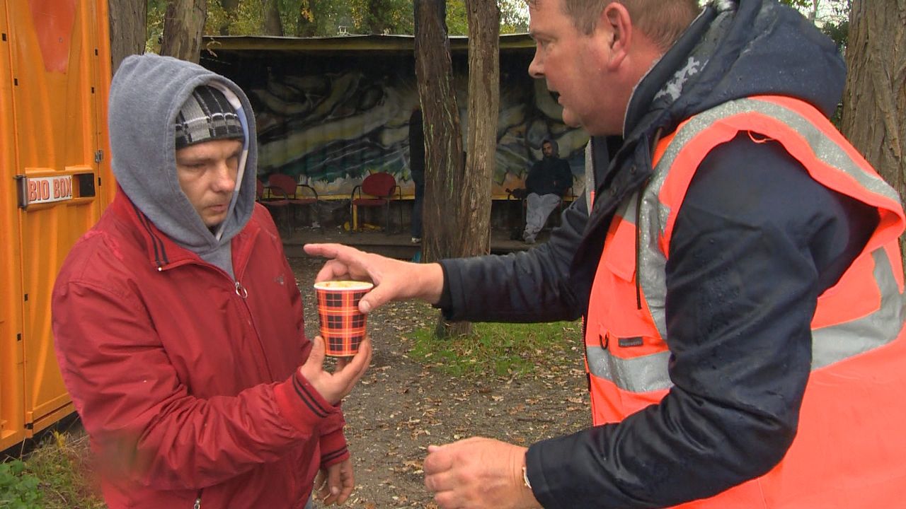 Met zijn bakfiets komt Wim aan bij een container. Wim legt uit: "Hier zitten vaak daklozen, dus hier fiets ik altijd even langs." Ook nu zitten er drie mannen. Een van hen komt meteen naar Wim toe gelopen. Gretig pakt hij de warme kop soep aan. In gebrekkig Engels legt hij uit: "Dit is heel fijn. En de soep is lekker warm."