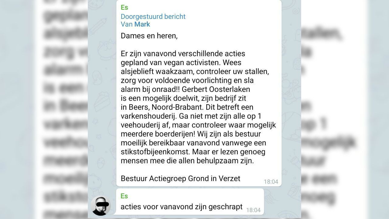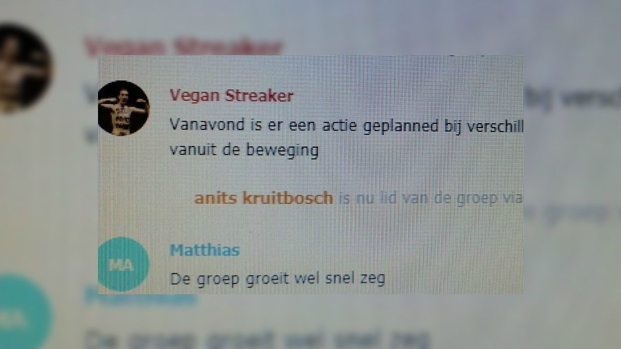 16.58: Het begon al 's middags. In een van de whatsappgroepen wordt een afbeelding geplaatst, die door 'Vegan Streaker' in een chat van dierenactivisten is geplaatst. Onduidelijk is nog waar de actie gaat plaatsvinden.