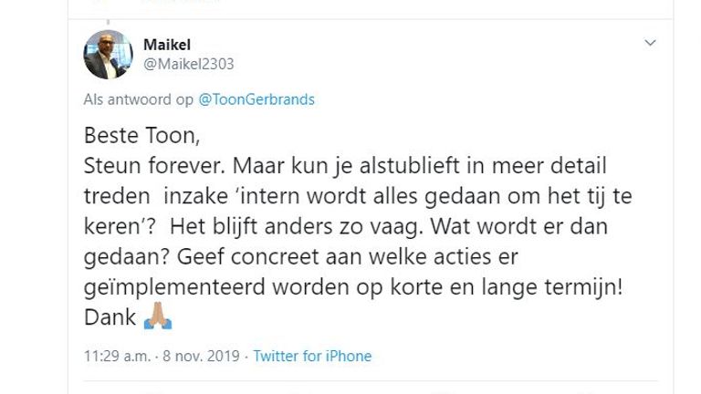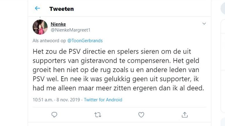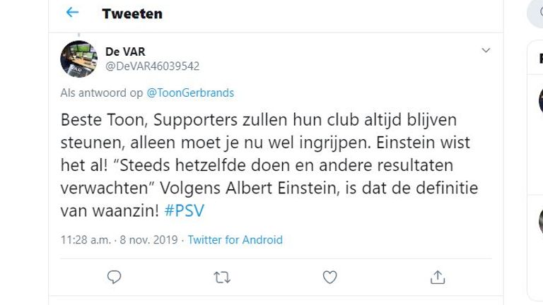"Steun altijd. Maar een trainer zonder visie kan echt niet meer. Hij zal altijd een clubicoon blijven, als trainer is hij echter nu niet geschikt voor PSV", reageert bijvoorbeeld Marcel Wolfs op de tweet van Gerbrands.