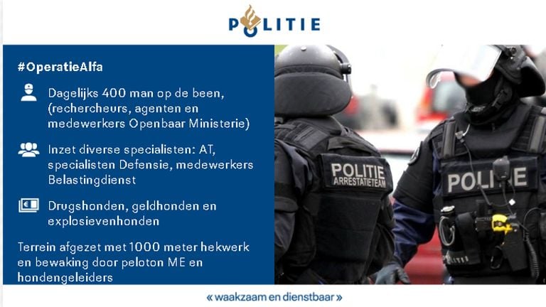 De politie noemt de actie Operatie Alfa. Justitie en politie jagen al langer op de familie R. “Wij denken dat op dit kamp de criminele activiteiten van de familie werden beraamd. Samen met specialisten van Defensie en de Belastingdienst zoeken wij op het terrein onder meer naar geld, drugs een vuurwapens.” Ook op andere plekken in Oss en omgeving wordt gezocht.