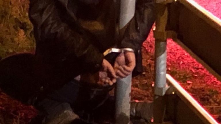 Terwijl de ontmanteling maandagavond werd voorbereid, ontstond er ineens ophef rond het pand. Agenten schreeuwden. Er renden twee mannen over een zijweg van de Dorpsstraat. Ze leken te vluchten. Eén van hen werd tegen de grond gewerkt door een politieagent. Een brandweerman en toezichthouder hielpen mee met de arrestatie. Kort daarna werden nog vier mannen gevonden en gearresteerd. Een van de arrestanten werd na zijn aanhouding vastgeketend aan een verkeersbord.