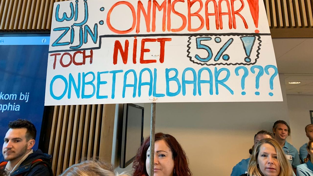 Ook bij het Máxima Medisch Centrum in Eindhoven leggen verpleegkundigen het werk neer. In een van de locaties zetten de stakers een protestlied in. "We zijn aan het eind van ons geduld. Ik leg patiënten in de watten, maar ik loop mezelf voorbij!"