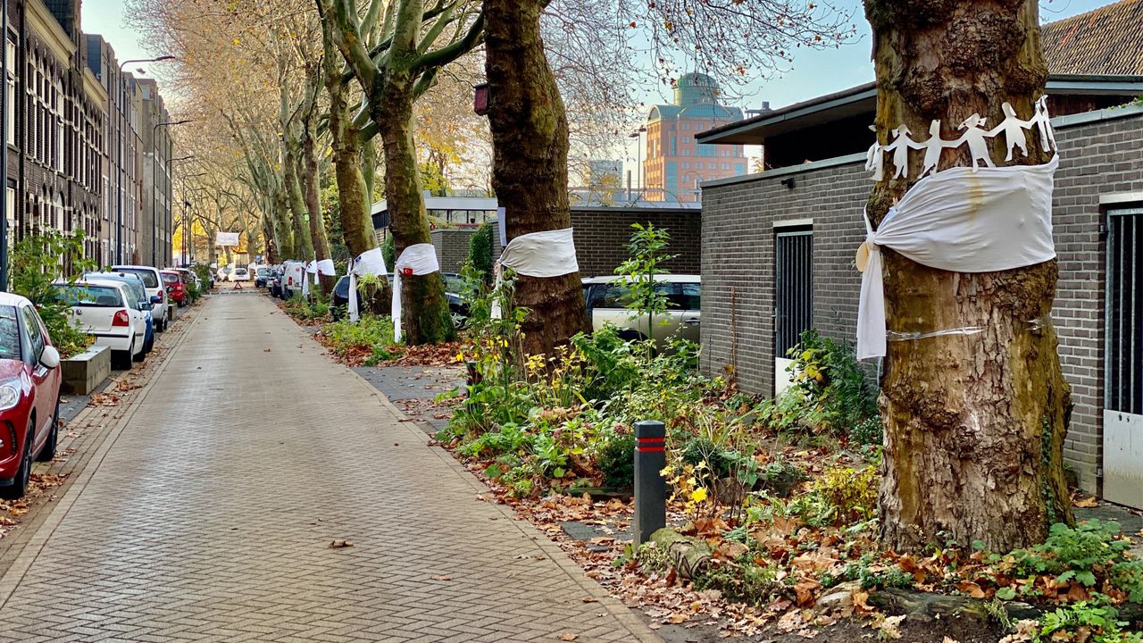Het protest begon met een paar mooie strikken om de bomen die niet gekapt mogen worden. Iedereen weet zo meteen om welke bomen het gaat. Met rechts de ode van buurtbewoonster Janine, die staat voor de verbinding met elkaar en met de platanen