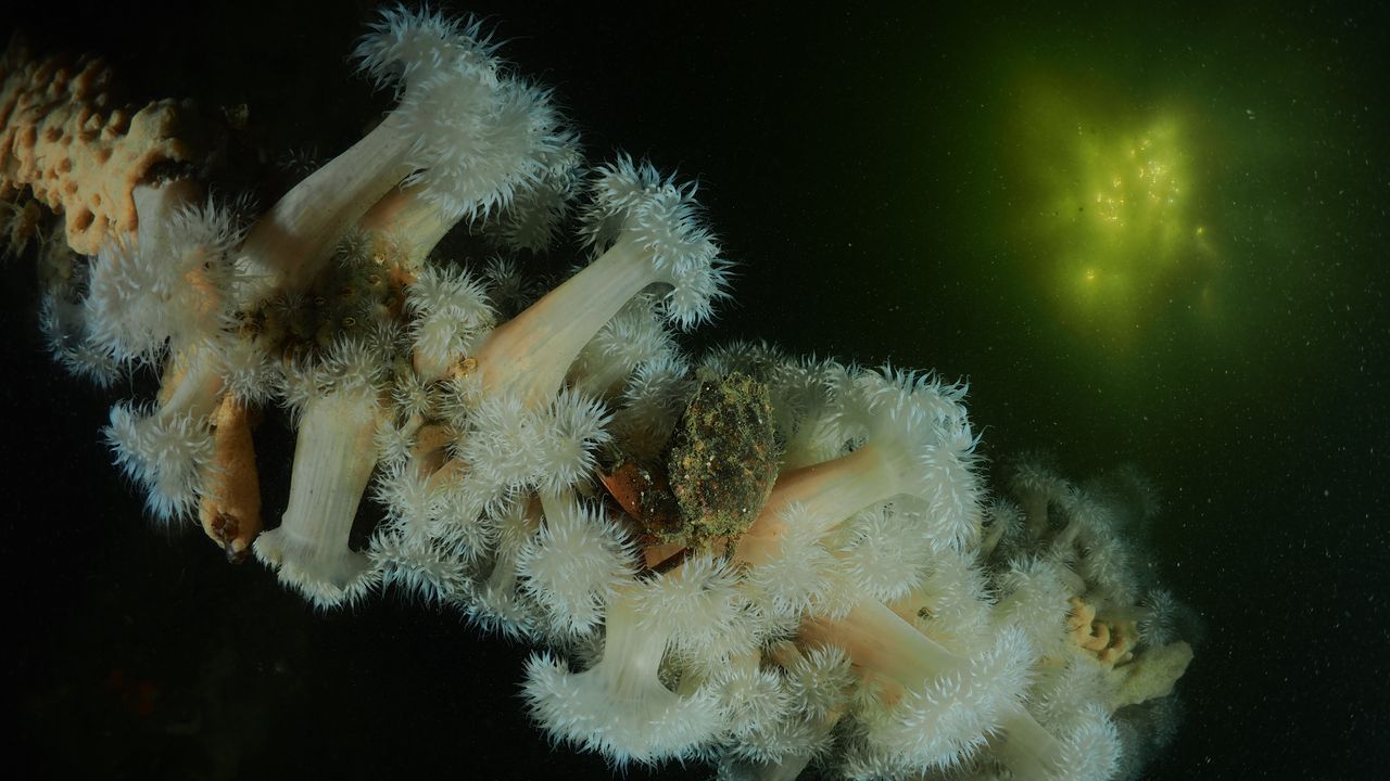 Zeeanjelieren (een anemoonsoort) met daartussen een strandkrab in de Oosterschelde: