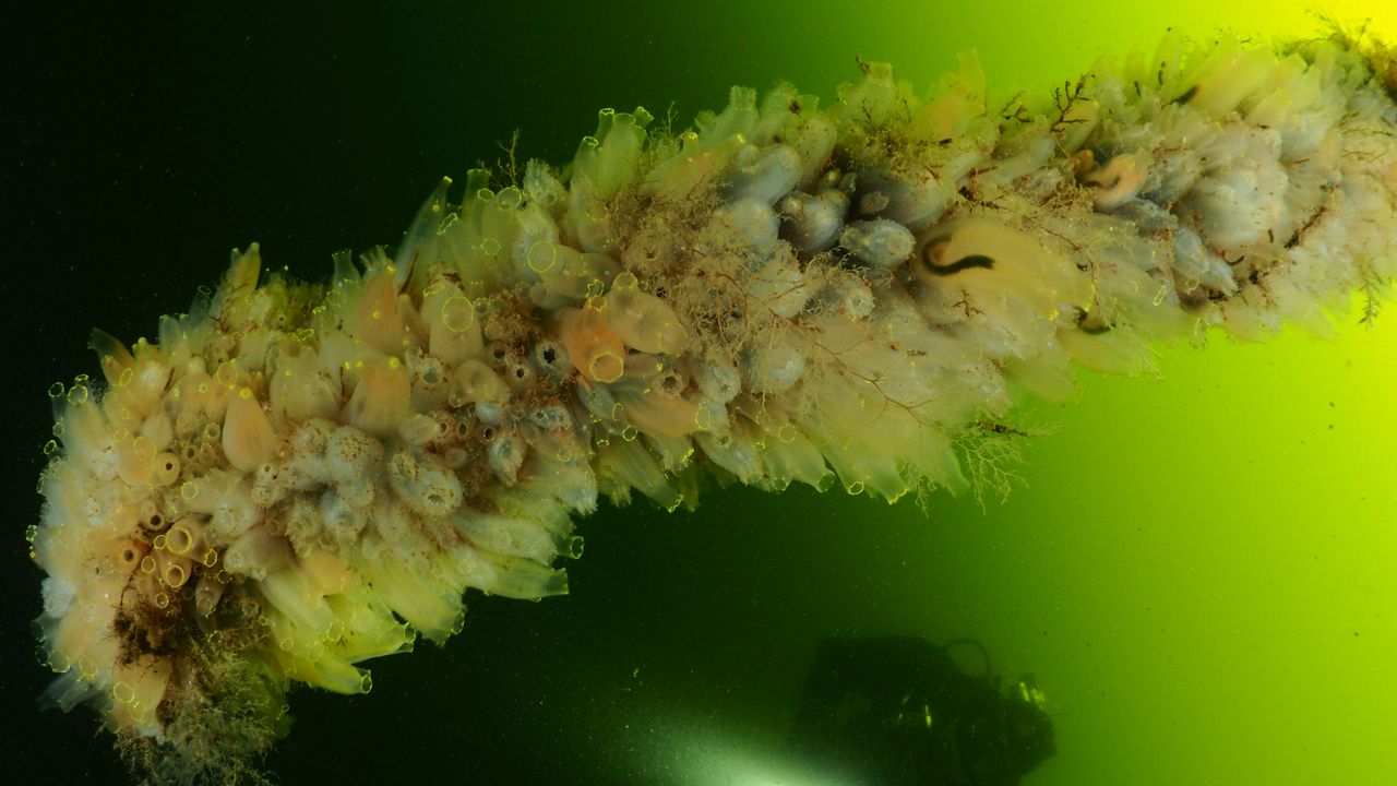 Een grote massa 'zakpijpen' (zeediertjes) aan strengen touw in in het perceel van een mosselkweker bij de Bergse Diepsluis in de Oosterschelde: