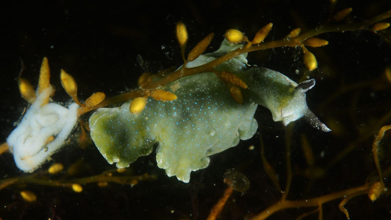 Het diertje op deze foto is een 'groene wierslak', het witte bolletje onder het slakje is een pakketje eitjes van de slak. Gemaakt in het Grevelingenmeer:
