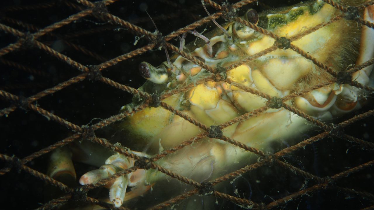 Een fuik van een visser in de Oosterschelde met daarin een strandkrab die 'zielig door zijn 'tralies' kijkt':