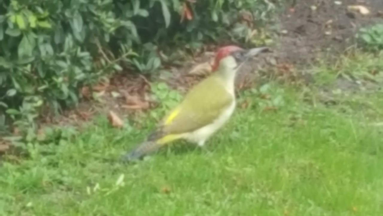Op de foto hierboven, die Anthony Verspaget maakte, zie je in het gras een redelijke grote groenige vogel met een gele stuit, een rode pet op de kop en wat zwart rond de ogen. We hebben hier te maken met een groene specht. . Groene spechten kunnen maximaal 34 centimeter groot worden. Dit is te vergelijken met een Turkse tortelduif. Het hoofdvoedsel van groene spechten bestaat voornamelijk uit mieren en hun larven. Deze laatsten leven vooral in de grond. Groene spechten zijn de meest gespecialiseerde mierzoekende spechten van alle spechten. Je zult groene spechten dan ook vaker op de grond zien pikken dan op bomen.. Dit laatste komt wel voor, maar dan pikken ze de mieren vooral van de bomen af. Op de grond, vooral in kort gras, gaan ze op zoek naar allerlei soorten mierennesten. Het liefst eten ze de behaarde rode bosmieren, maar ook andere mieren staan op de lijst. Naast mieren eten ze soms ook andere geleedpotigen, zoals spinnen en een diversiteit aan insecten. Tot slot kan ik ook nog melden, dat ze zicht soms tegoed doen aan bessen, zoals wilde lijsterbessen en vruchten als kersen, appels en druiven.