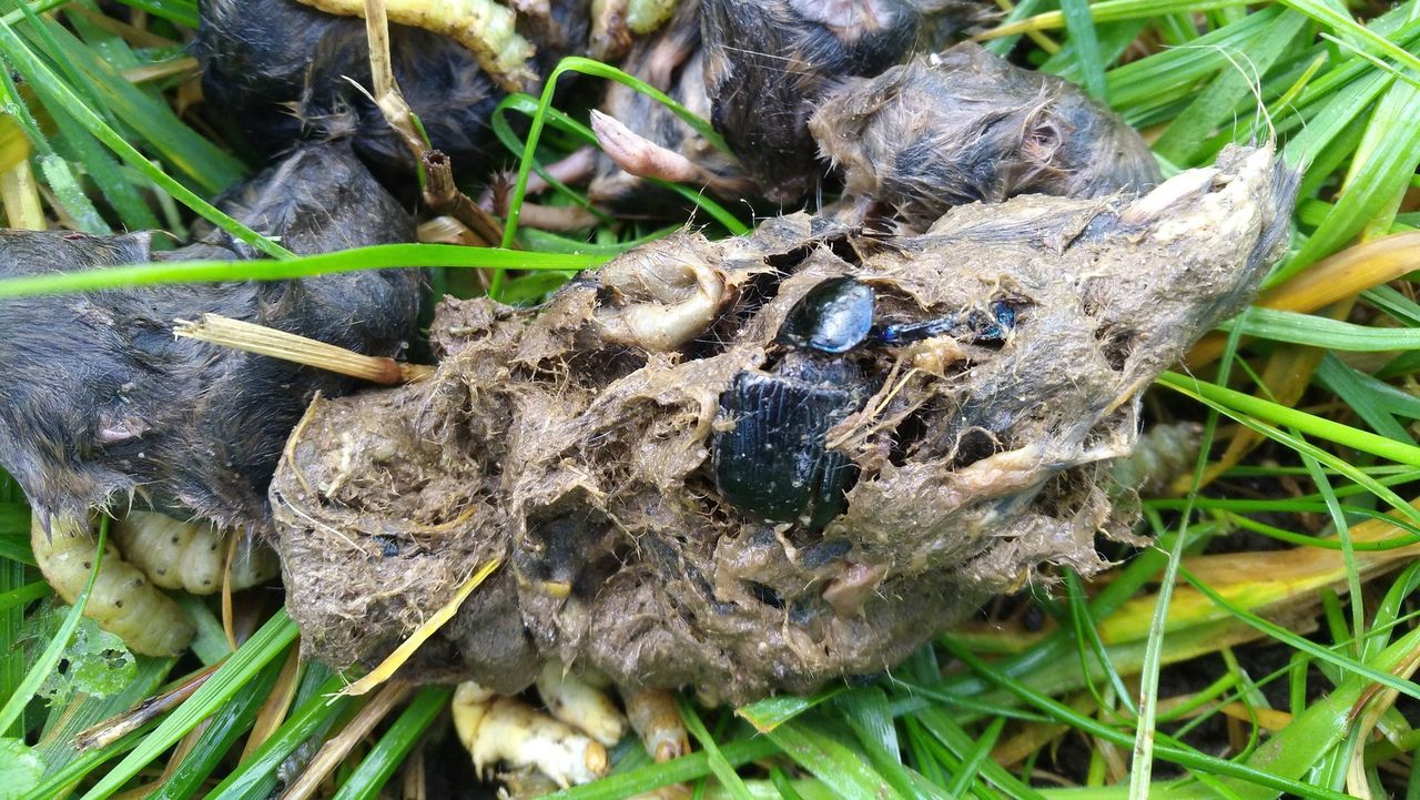 Op de foto van Wendy hierboven zie je een uit elkaar gehaalde vossendrol. De drol bestaat uit resten van haren met daarin zwarte schilden van kevers. Vermoedelijk mestkevers, want daar zijn vossen dol op. In zo’n drol kun je goed zien wat vossen eten. Naast dekschilden van kevers zal je ook vaak haren tegenkomen van muizen en konijnen. Heeft de vos muizen gegeten, dan zie je soms botjes of schedeltjes van die muizen. Als een vos een konijn gevangen heeft dan is dat een maaltijd voor tenminste twee dagen. Vossen eten vaak eerst kop op en een beetje van de romp. De rest begraven ze voor een tweede maaltijd. In het najaar kun je in zo’n vossendrol ook resten van vruchten en noten vinden.