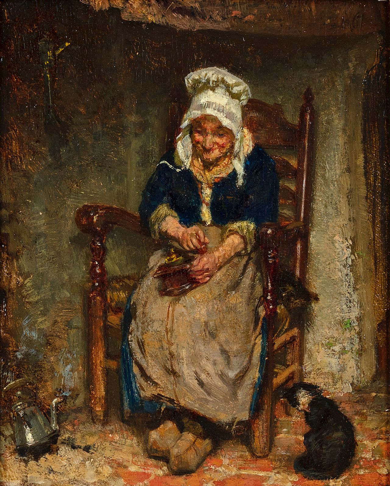 Het gaat om een studie van een boerderij door Karel Klinkenberg en een koffie malende boerin (ook bekend als de heks van Dongen) door August Allebé, legt hij uit.