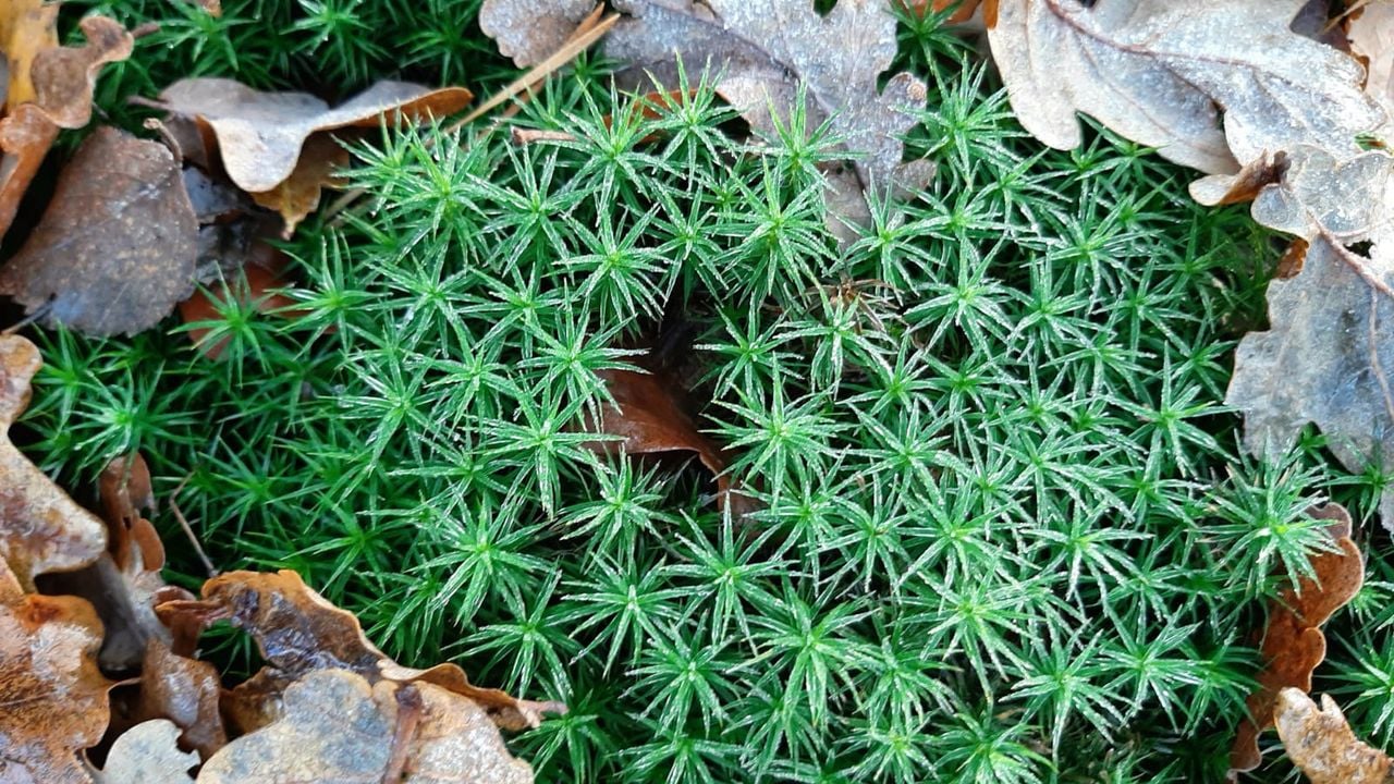 Op de bovenstaande foto zie je tussen de herfstbladeren mooie stervormige groene bladeren. We hebben hier te maken met haarmos. Dit mos is in principe een vrij groot en stevig mos, wat maximaal vijftig centimeter lang kan worden. Het meest kun je haarmossen tegenkomen in diverse soorten van bossen, vooral op de bodem. Andere mossen kom je weleens tegen op stammen of in bomen, maar haarmos niet. In bossen kan haarmos een heel grote aaneengesloten tapijt creëren. Het mos is een vrij sterke en mooie groene soort en valt het meest op in de herfst en winter. Vanaf half december zie je boven de groene delen uit prachtige rode sporenkapsels. Na verloop van tijd zijn die sporen rijp en worden ze verspreid door met name de wind. De grootste bedreiging voor haarmossen is uitdroging en betreding.