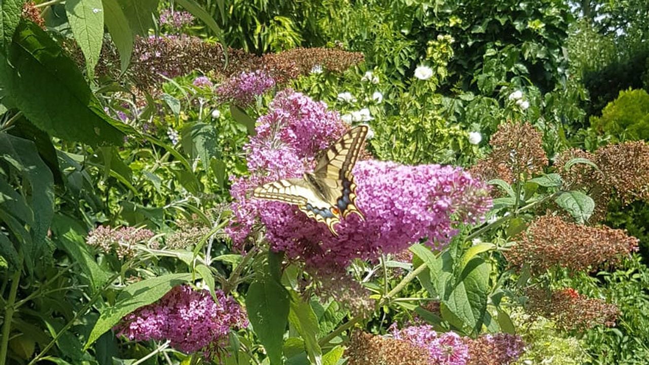 Op de foto hierboven zie je op een vlinderstruik - of buddleja - een prachtige grote vlinder zitten. De vraag die ik kreeg is welke vlinder dit is. Je ziet op die struik een vlinder met overwegend gele kleuren. Op de vleugels zie je opvallende zwarte vlekken en strepen. Op het einde van de vleugels zie je ook nog twee langwerpige, zwart gekleurde vleugelaanhangsels, die je ook wel slippen noemt. Naar mijn idee is dit een van de mooiere dagvlinders van Nederland, de koninginnenpage. Deze dagvlinder heeft een spanwijdte van maximaal 75 millimeter en is daarmee de grootste dagvlinder in Nederland. De vraag werd gesteld in oktober, dus nu zal deze mooie dagvlinder niet meer te zien zijn. Daarvoor moeten we weer wachten tot de zomer van 2020.