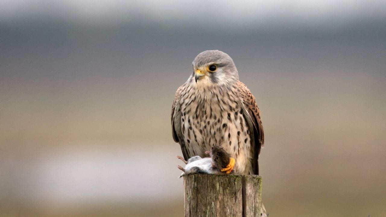 Op bovenstaande foto zien je een prachtig mooi torenvalkmannetje. De vraag is wat hij onder zijn klauwen heeft als prooi. Volgens mij is dit een muis. Torenvalkmannetjes hebben een mooie grijsblauwe kop. Ze worden in het algemeen niet groter dan zo’n 35 centimeter. Het zijn echte jagers, die jagen op dieren die op de grond leven. Torenvalken zijn specialisten in het vangen van kleine zoogdieren. Het meest vangen ze woelmuizen zoals aardmuizen en veldmuizen. Maar ook grote insecten en zangvogels op het open land. Soms zelfs kuikens van weidevogels, maar dat alles alleen als er geen muizen aanwezig zijn. Vanaf een zitpost speuren ze de omgeving af en als ze een prooi in beeld krijgen, gaan ze in trage en lage vlucht op de prooi af. Op de plek aangekomen stijgen ze iets op. Ze hangen dan in de lucht boven de prooi. Dit laatste noemen we bidden. Na een tijd duiken ze in een stootduik op de prooi. Dit is hun manier van een prooi pakken, want ze zijn niet snel genoeg om vogels in de lucht te pakken.