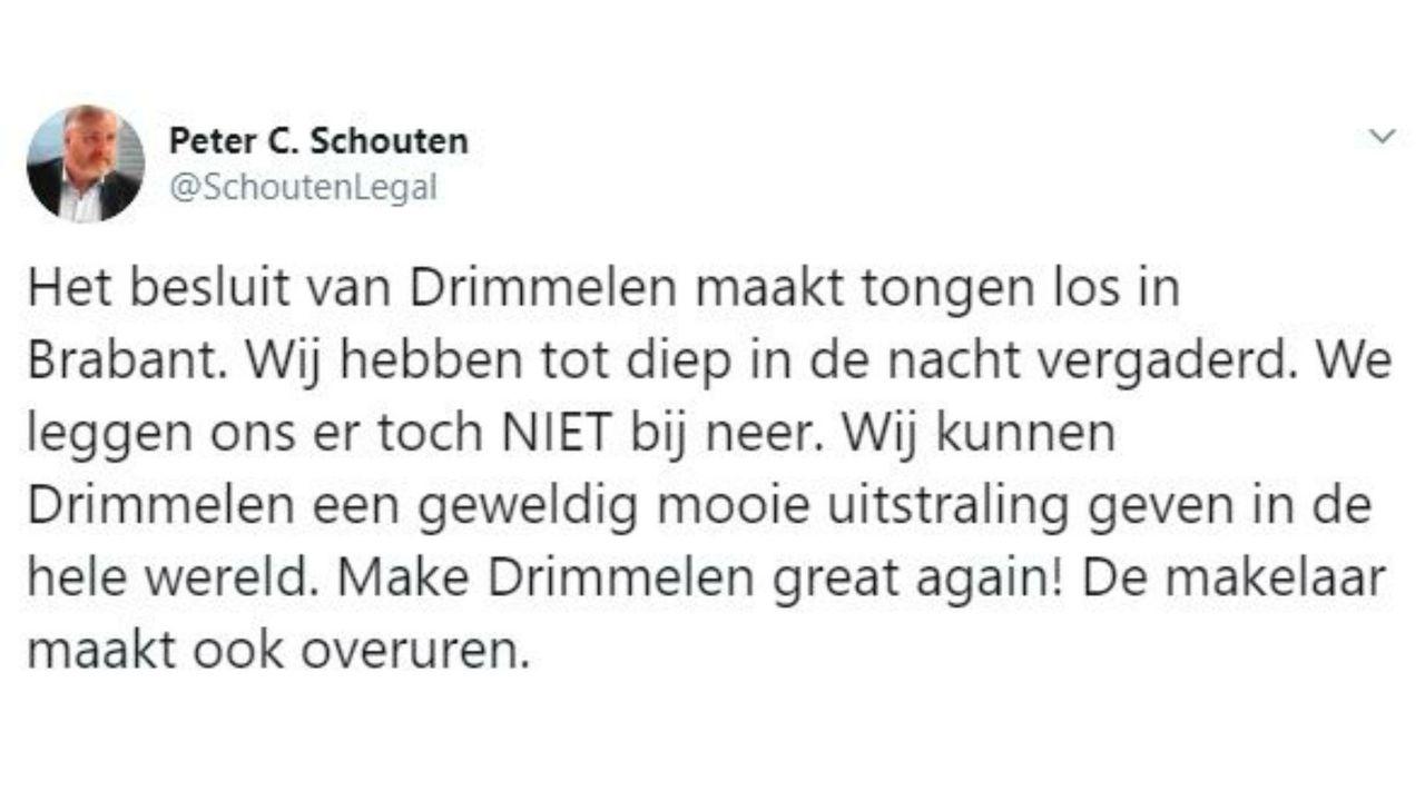 Peter Schouten noemt het besluit van de gemeente 'een tegenslag'. "We worden hierdoor eigenlijk qua planning zes maanden achteruit gegooid. En we hadden het ook niet verwacht, want we bieden Drimmelen van alles. Er zijn geen nadelen." De initiatiefnemers van Project C willen nu in plaats van de politiek, de burgers van Drimmelen overtuigen van hun plan. Hoe ze dat precies gaan doen, daar laat Schouten zich nog niet over uit.
