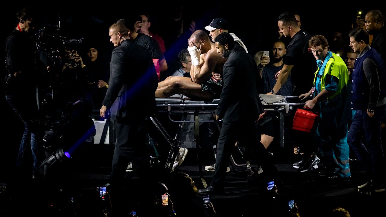23.11 Badr Hari wordt met de handen voor het gezicht op een brancard afgevoerd.