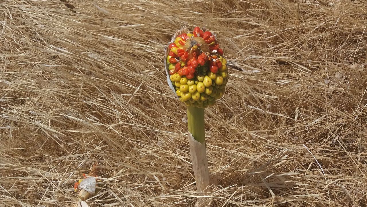 Op de foto hierboven zie je op een steel in een soort houder groene en oranjerode bessen. Volgens mij zijn dit de vruchten van een aronskelk. Deze vruchten worden eerst groen, maar als ze rijp zijn oranjerood. Daarnaast denk ik dat we te maken hebben met een niet wilde - gevlekte - aronskelk, maar met de Italiaanse aronskelk, die steeds meer als tuinplant in onze omgeving verschijnt. De naam aronskelk of arum komt vermoedelijk uit de tijd dat Jozef en de verkenner Kaleb naar het beloofde land trokken. Zij namen zij de staf van Aeron, de broer van Mozes, mee. Op deze staf droegen zij een druiventros. Nadat de druiventros van de staf was genomen, staken zij die staf in de grond. Op die plek schoot toen een aronskelk uit de grond. Dit werd het zinnebeeld van een gezegende vruchtenoogst.