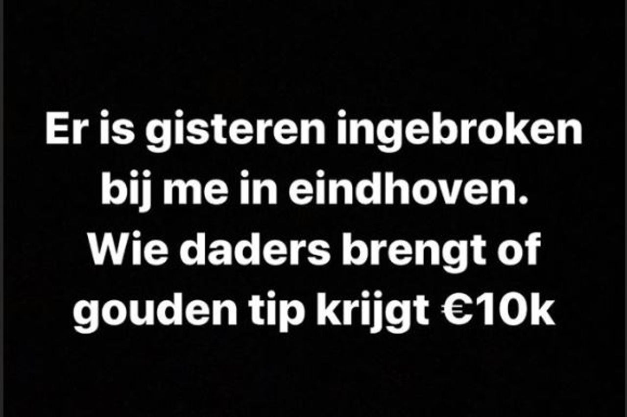 Dat schrijft de voetballer in zijn Instagram-story. Wat er gestolen is, maakt hij niet bekend. Maar hij heeft er naar eigen zeggen 10.000 euro voor over om de daders te vinden. "Wie de daders brengt of gouden tip krijgt 10.000 euro."