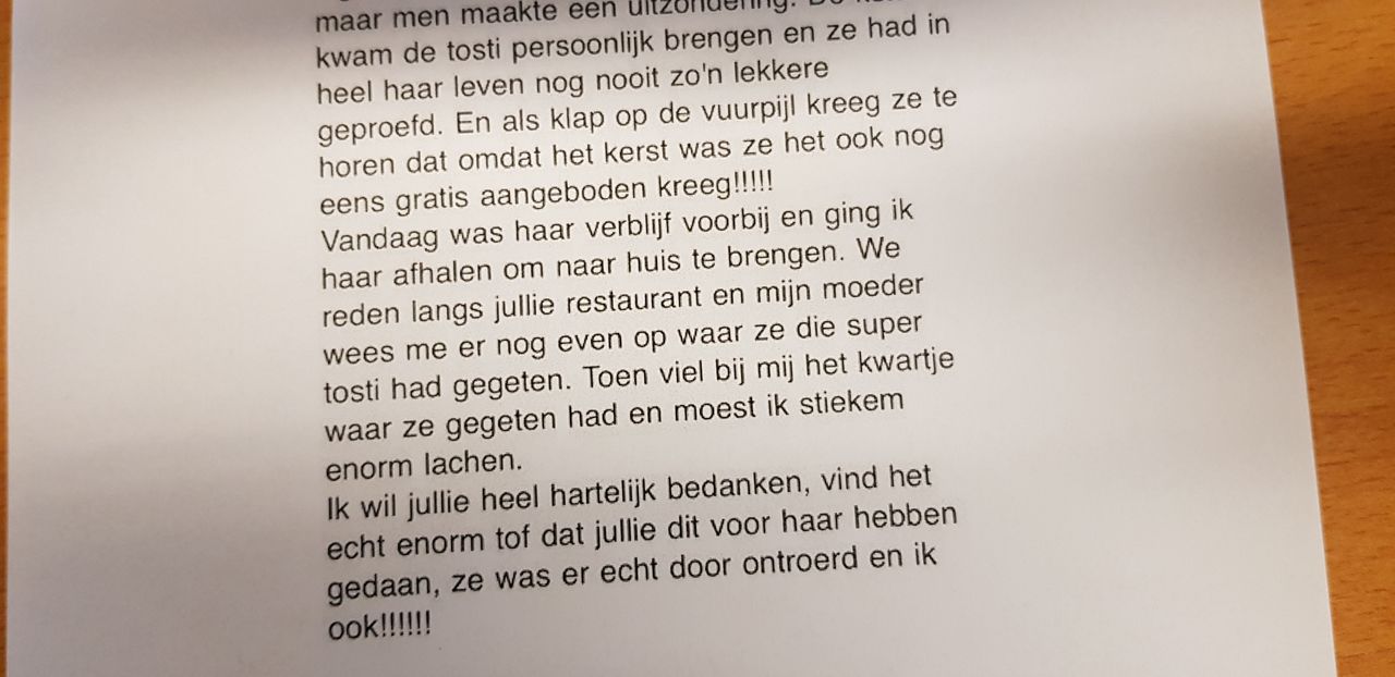 “Tijdens de kerstdagen krijg ik een enorm enthousiaste moeder aan de telefoon. Ze had zin gehad in een tosti en was daarvoor naar een restaurant aan de overkant gegaan. Ze vertelde dat ze enorm hartelijk was ontvangen en dat men had gezegd dat het eigenlijk niet mogelijk was een tosti te bestellen, maar men maakte een uitzondering.”