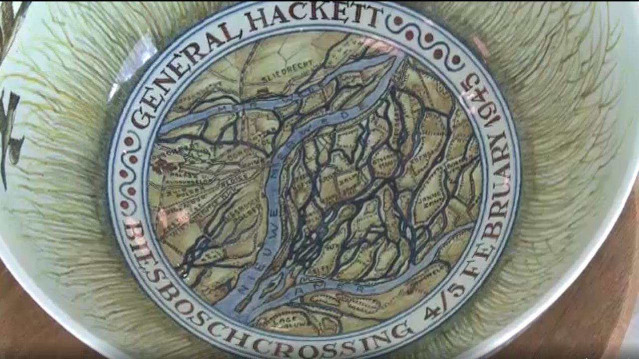 Net als een ‘bowl’, een schaaltje, die Hackett cadeau heeft gekregen van een Nederlandse militaire organisatie. Het is beschilderd met elementen van Hacketts vlucht via de Biesbosch
