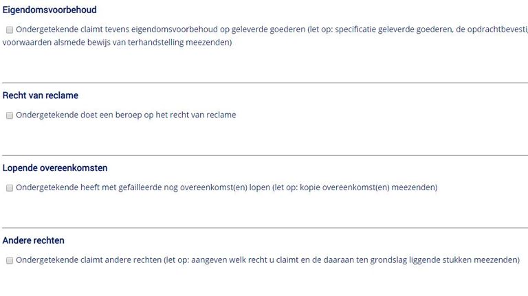 De aangestelde curator heeft op zijn site een vorderingsformulier staan. Klanten kunnen op die manier een poging doen hun geld terug te krijgen. Daar kom je termen tegen als ‘recht van reclame’ en ‘eigendomsvoorbehoud’. Niet voor iedereen even duidelijk, maar volgens curator Flip Schreurs is dit nu eenmaal hoe het vorderen werkt.